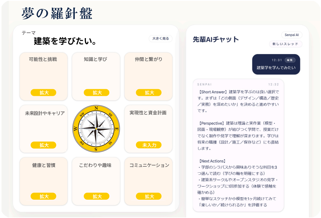 作成したマンダラに基づく行動提案や、AIエージェントによる継続的なメンタリング機能を搭載。学生の挑戦や試行錯誤のプロセスをすべてデータとして蓄積します。蓄積された行動履歴は、単なる記録ではなく「ユーザのアイデンティティ」として解析。対話を重ねるごとにAIの精度が向上し、一人ひとりの個性に最適化された、唯一無二のキャリア支援を実現します。