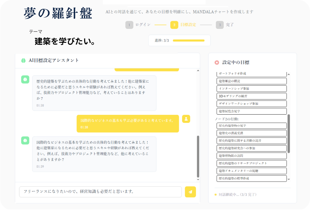 作成したマンダラに基づく行動提案や、AIエージェントによる継続的なメンタリング機能を搭載。学生の挑戦や試行錯誤のプロセスをすべてデータとして蓄積します。蓄積された行動履歴は、単なる記録ではなく「ユーザのアイデンティティ」として解析。対話を重ねるごとにAIの精度が向上し、一人ひとりの個性に最適化された、唯一無二のキャリア支援を実現します。